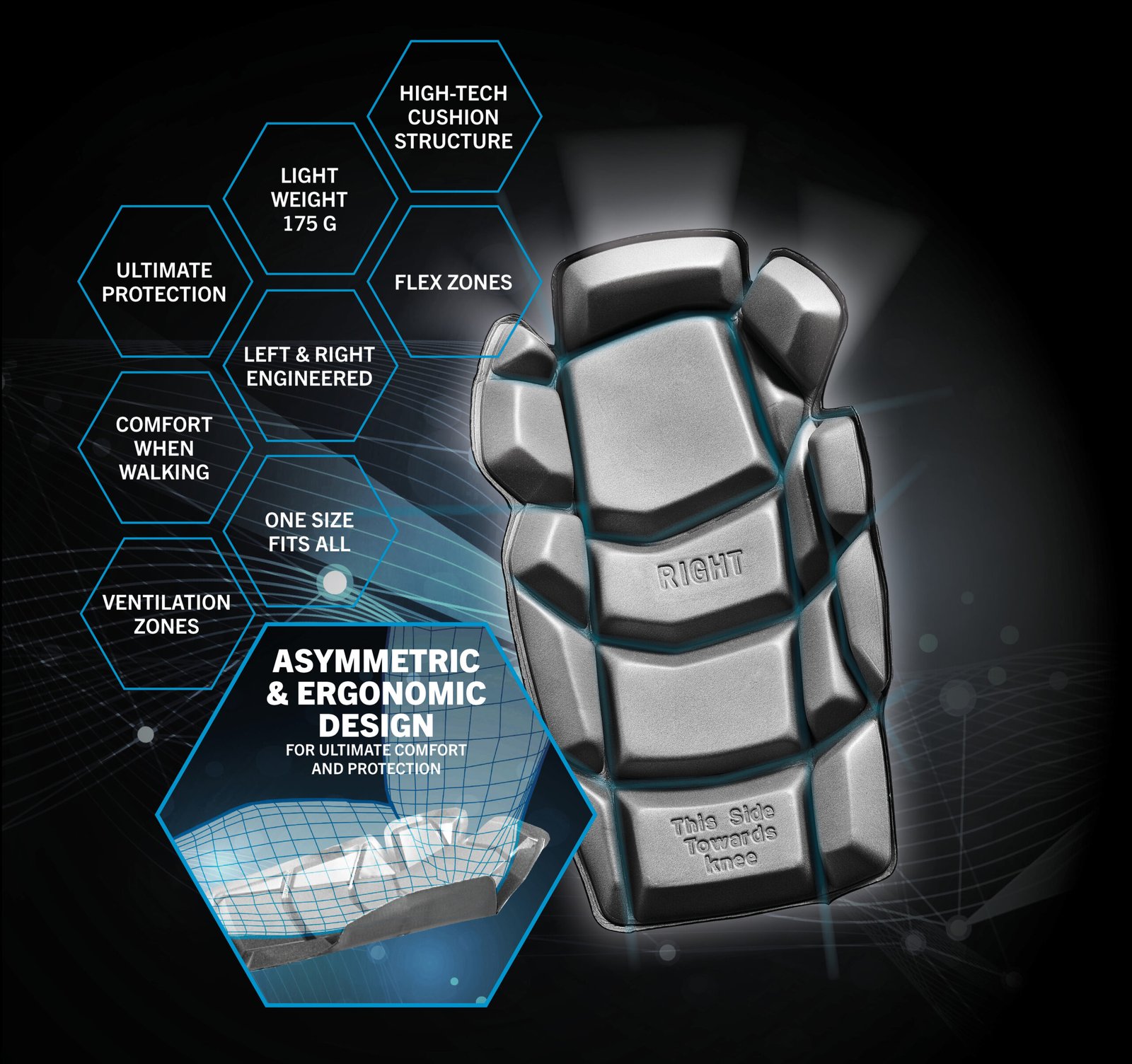 Mousse douce qui absorbe les chocs et offre une protection efficace des genoux. Conception asymétrique et ergonomique qui s’adapte à la forme du genou. Genouillères spécialement conçues pour les genoux gauche et droit. Matériau souple, léger et confortable. Convient à tous les métiers exigeant un travail à genoux fréquent. Double certification compatible avec les bas MASCOT dotés de poches pour genouillères de type SHORT/LONG selon la norme EN 14404. Dimensions 17 x 26 cm.