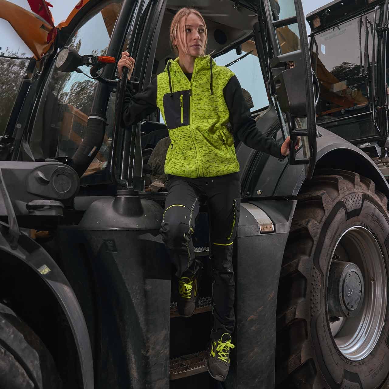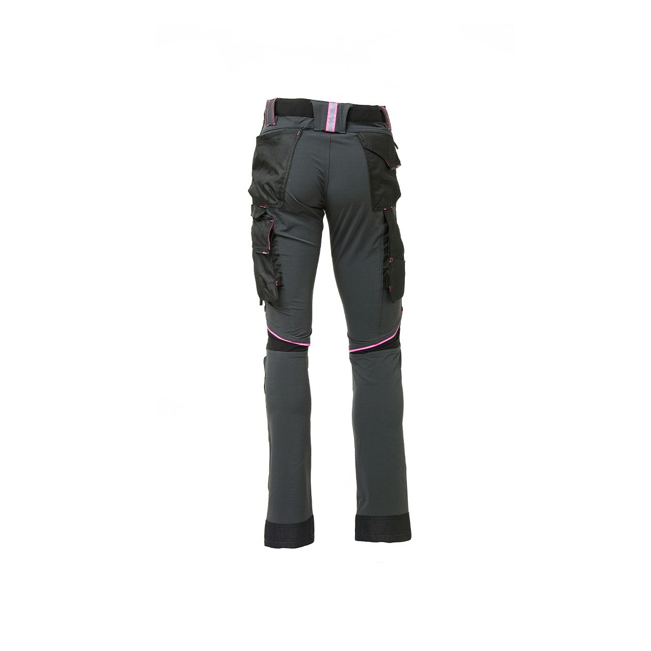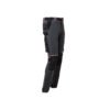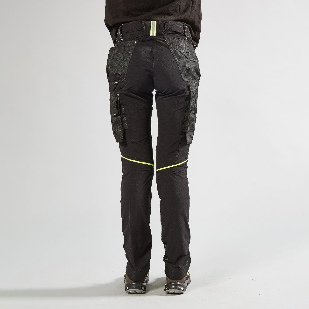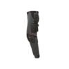 Poche latérale porte-outils, poche latérale multifonction avec porte badge rétractable, deux poches à l’arrière dont une avec patte et une avec fermeture velcro. Fermeture centrale avec zip YKK et bouton en caoutchouc anti-rayures.
