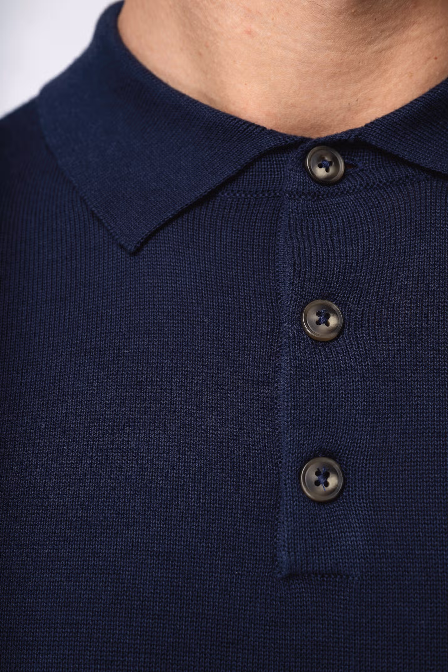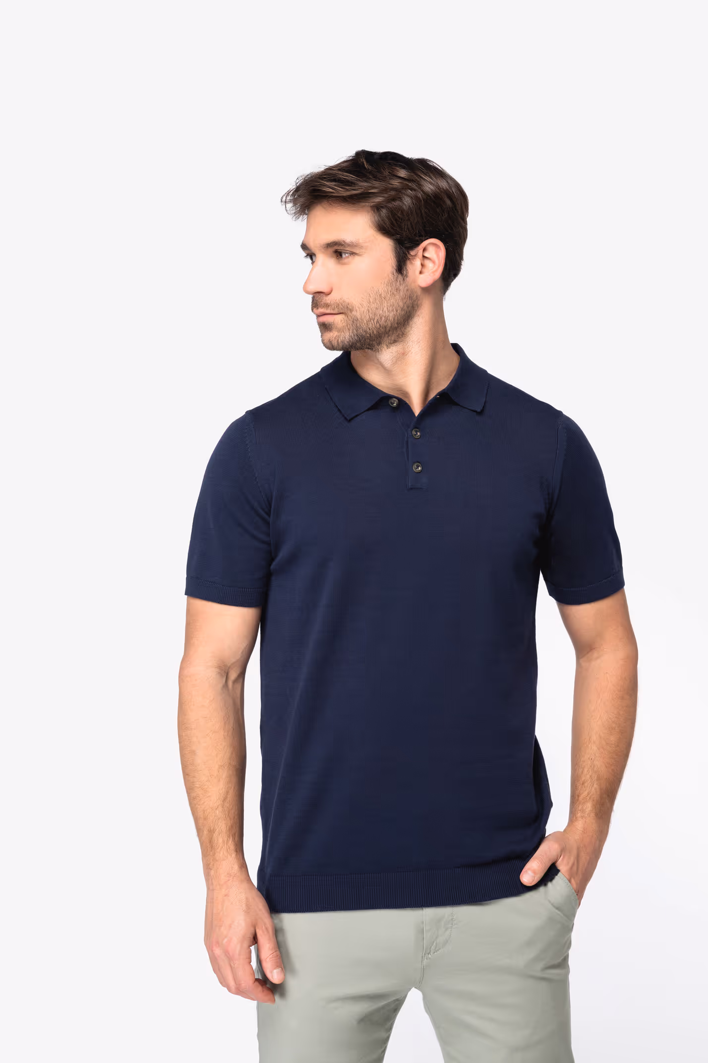 100% coton biologique. Coton peigné. Jauge 12. Coupe ajustée. Patte de boutonnage à 3 boutons. Boutons contrastés en plastique recyclé effet corne. Col et finitions bas de manches et de vêtement en bord côte 1 x 1. Bande de propreté en matière principale. Maille tricotée en « Fully Fashion ». Poids moyen en taille L : 225 g.