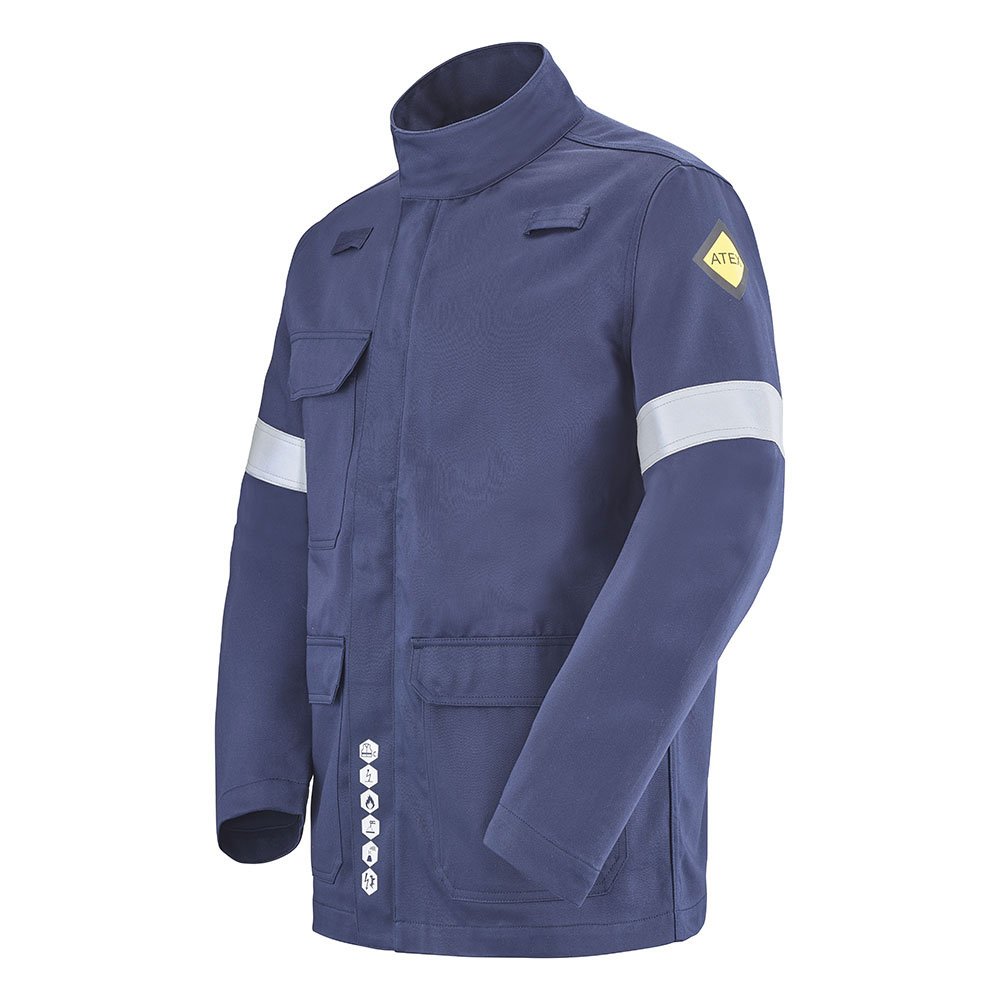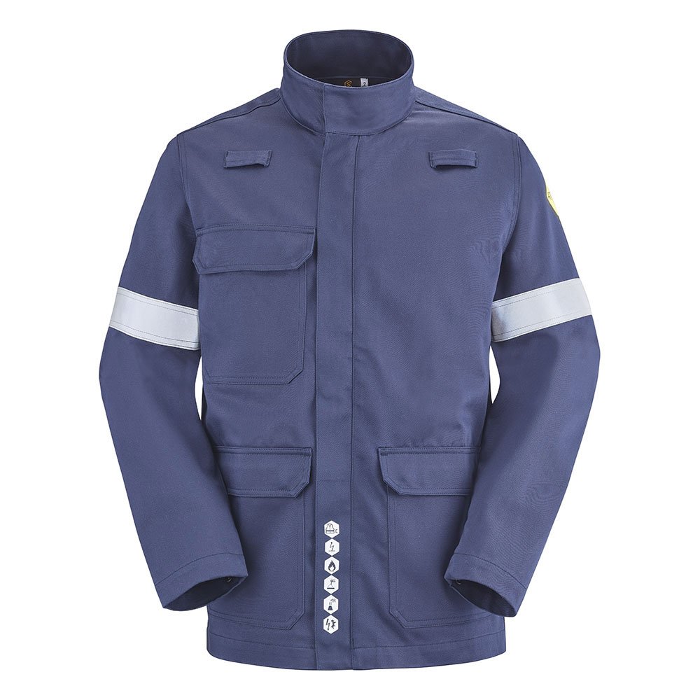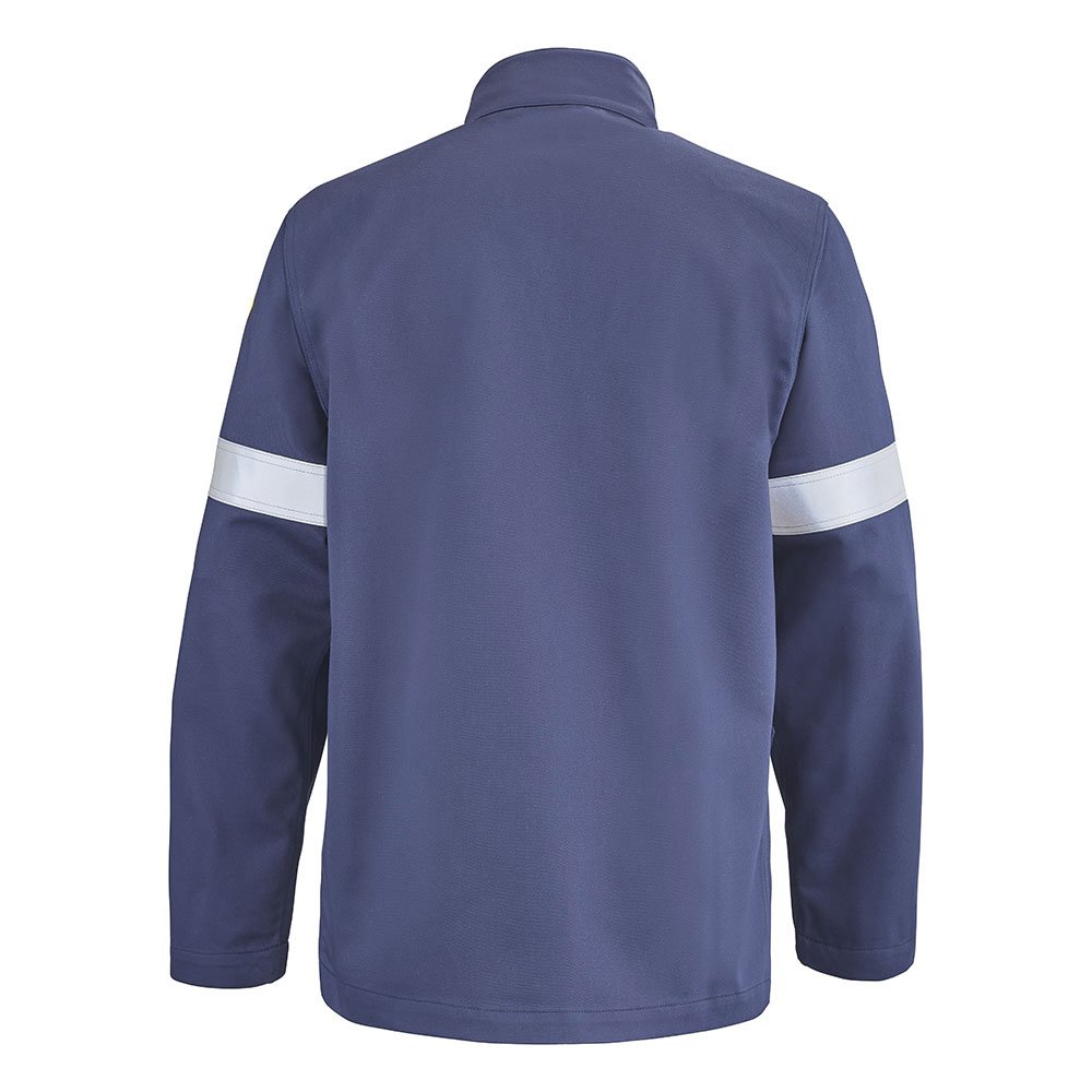 Devant fermé par fermeture à glissière sous patte maintenue par pressions cachées | Poche poitrine sous rabat fermé par pressions cachées | Poches basses sous rabat fermé par pressions cachées | Passants porte-dosimètre | Bas de manches réglables par pression cachée | Bandes de 50mm rétro-réfléchissantes