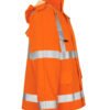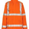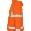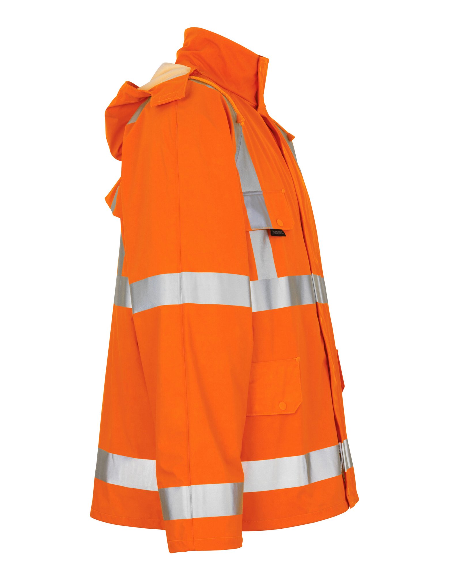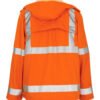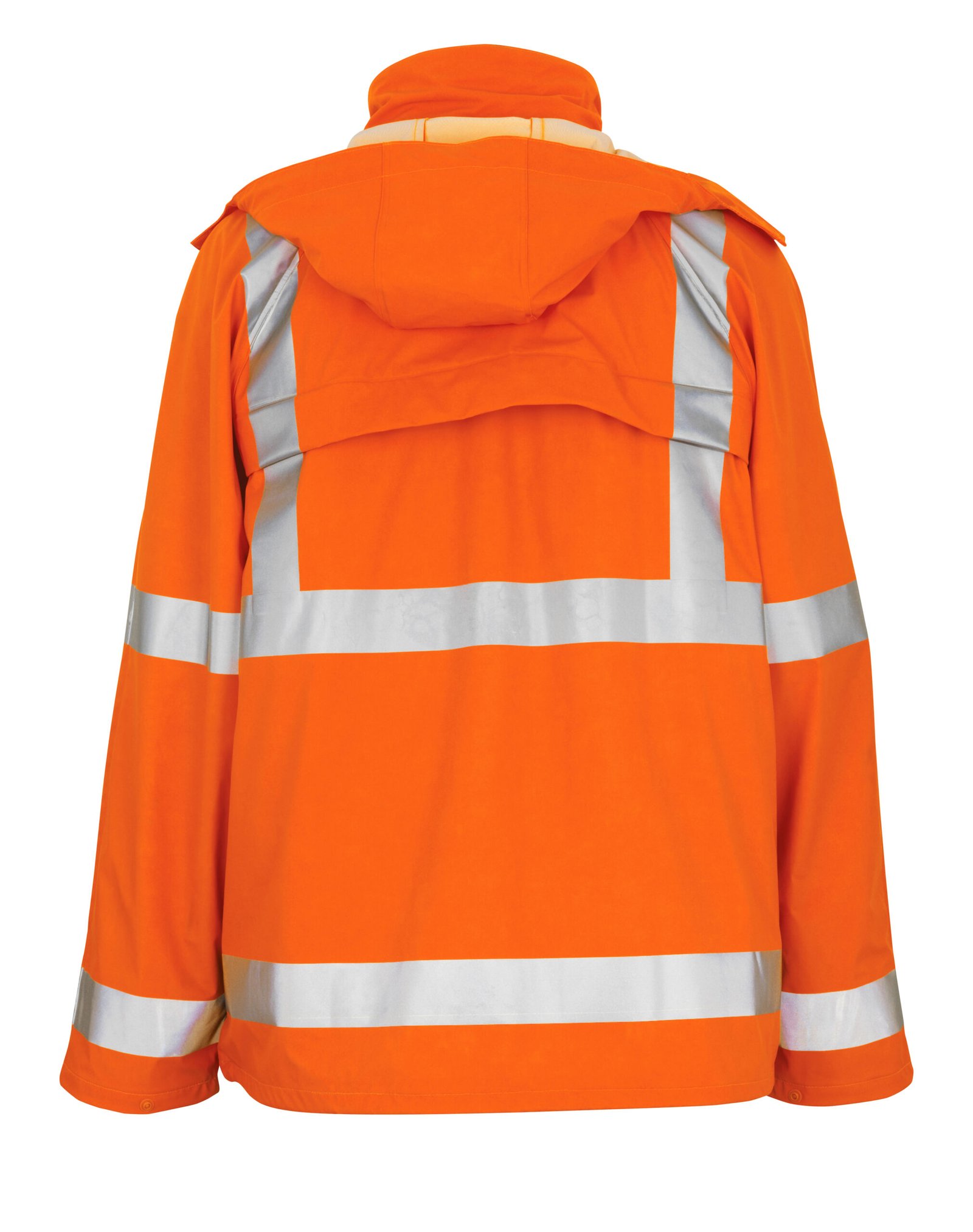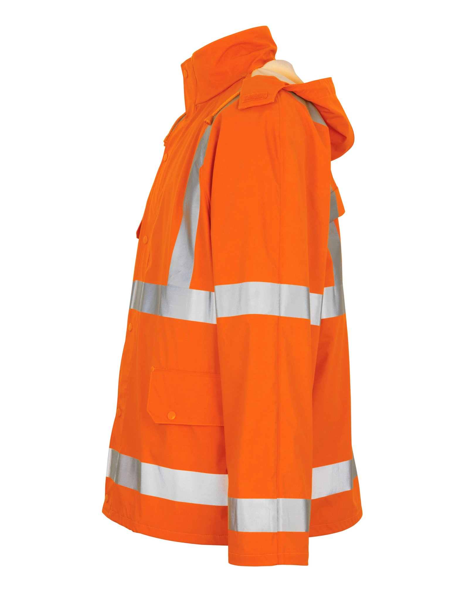 Coupe-vent et imperméable. Tissu fluorescent avec bandes rétroréfléchissantes horizontales et verticales. Coutures thermosoudées. Capuche avec cordon de serrage inséré dans le col. Fermeture zippée et rabat coupe-vent fermé par boutons-pression. Poche poitrine sous rabat avec fermeture bouton-pression. Poches latérales sous rabat avec fermeture bouton-pression. Ventilation dans le dos. Taille ajustable à l’aide d’un cordon élastique de serrage. Boutons-pression pour resserrer les poignets.